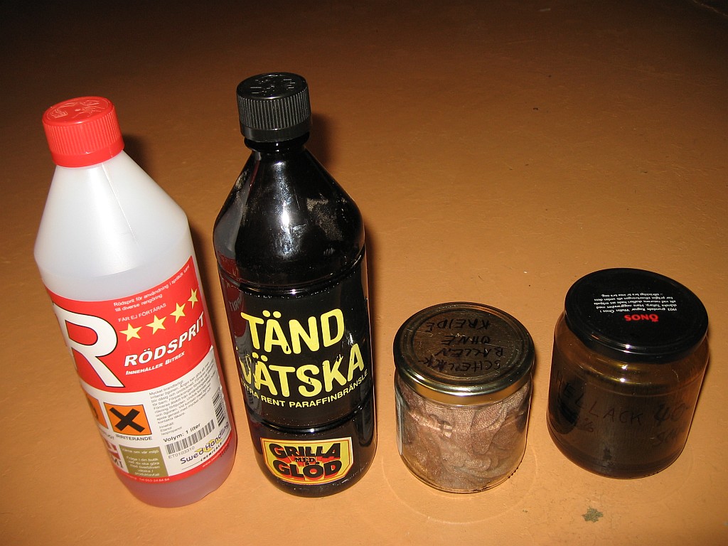 Von links nach rechts: Brennspiritus, Paraffin (Grillanzünder), der Polierballen, alkoholische Schellacklösung 30 bis 40%. Mehr braucht man eigentlich nicht.