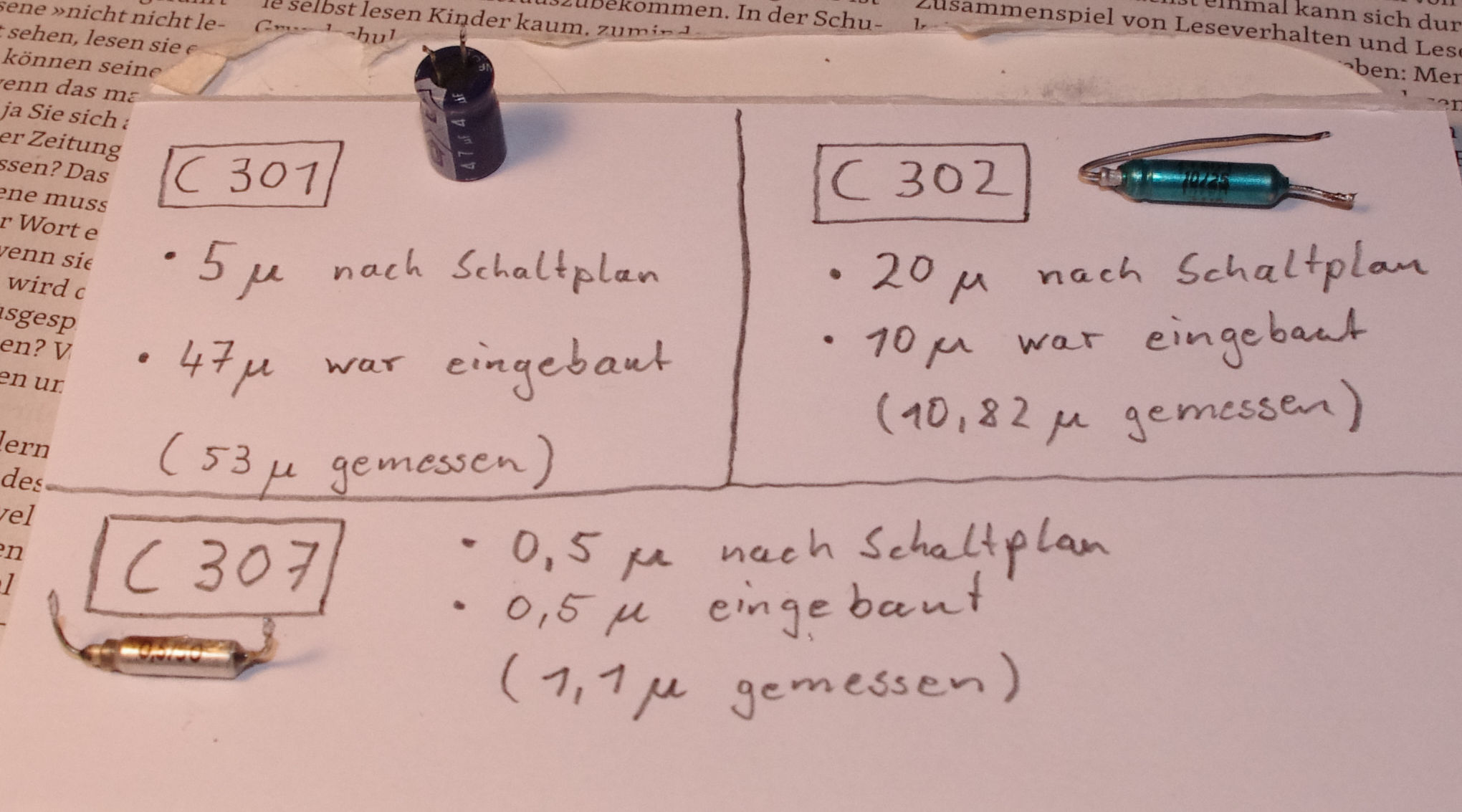 C 301 wurde offensichtlich in der Vergangenheit schon einmal gewechselt. Es wurde hier aber ein 47 u statt eines 5 u eingebaut. C 302 sollte nach Schaltplan 20 u haben, nach Beschriftung und Messung hat er aber 10 u. C 307 hat nach Schaltplan und Beschriftung 0,5 u, nach Messung jedoch etwa 1,1 u.