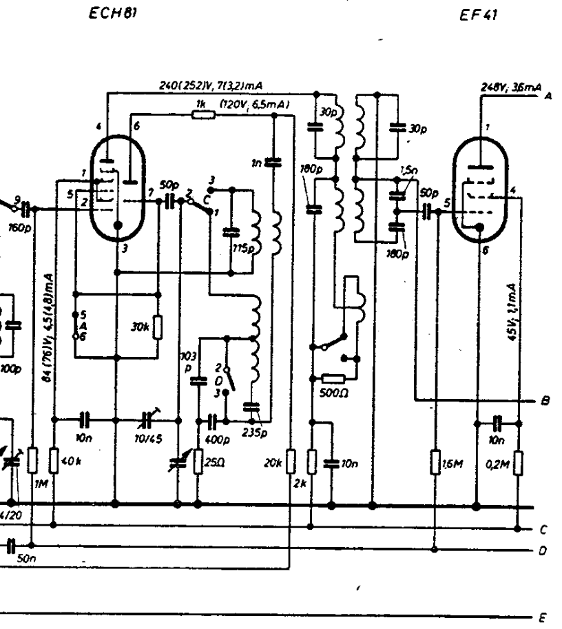 1) Anodenspannung am Lade-Elko 2) Anodenspannung am Siebelko 3) Anodenspannung an der Anode der 2.ZF-Röhre EF41 4) Schirmgitterspannung der 2. ZF-Röhre EF41 5) Punkt 3 und 4 an der 1. ZF-Röhre EF41 wiederholen 6) Beide Anodenspannungen der Röhre ECH81 7) Schirmgitterspannung des Mischteils der ECH81