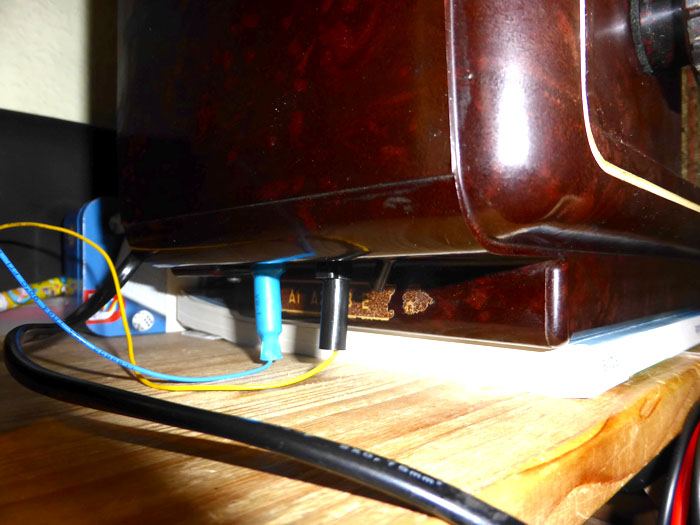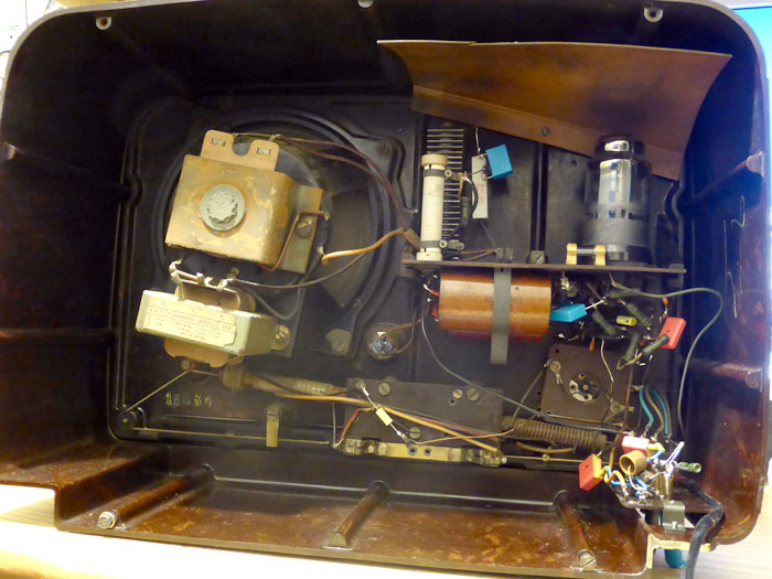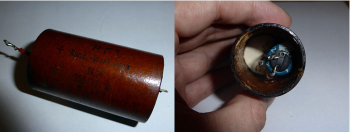 Damit das Radio spielt war auch der Austausch einiger Kondensatoren nötig. Die Optik der Elektrolytkondensatoren konnten durch vorsichtiges Entkernen erhalten bleiben. Ein Foto der aktuellen Kondensatoren in Drauf- und Seitenansich habe ich angefügt. Die Seiten wurden mit Füllmateriel verschlossen. Leider waren nicht alle zu ersetzende Kondensatoren in axialer Bauweise verfügbar, so muß das Gerät im weiteren Verlauf noch einmal auf den Basteltisch. Nachteilig beim 1U11 empfinde ich die Lage der Antennen- und des Erdanschlußes. Wie im Bild zu sehen, gehen die Anschlüße auf der linken Seite nach unten weg. Das Gerät muß mittig auf einer kleinen Erhöhung stehen, möchte man den Steckern und der Anschlußleiste keinen Schaden zufügen.