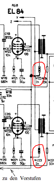 beim Monogerät beträgt der Widerstand nur 1 kOhm, eben nur für eine Endröhre. Für die Rechnung genügt eine Betrachtung nur der Ruheströme nach beiden Richtungen. Ein Widerstand transformiert sich mit dem Quadrat des Übersetzungsverhältnisses am Ausgangstrafo. Für die Rechnung müßte das Übersetzungsverhältnis bekannt sein. Wegen des Blindanteils müßte man genau genommen komplex rechnen. Ich denke, die Entwickler dieser Schaltung haben den Widerstand empirisch ermittelt. In der analogen "Schwachstromtechnik" war das eine sehr verbreitete Methode. Die Starkstromer, zu denen ich eine Zeit lang gehörte, haben die Schwachstromer oft um diese Möglichkeit beneidet, allerdings auch mehr oder weniger verachtet :-) Für eine optimale Brummkompensation würde ich diese Widerstände variabel machen. Damit könntest Du auch Streuungen der Röhrendaten kompensieren.