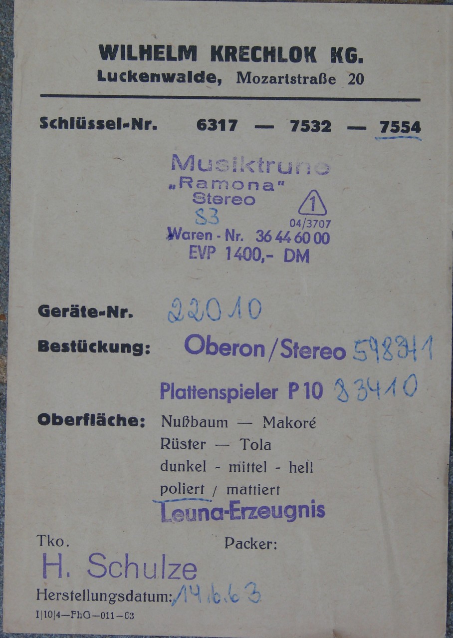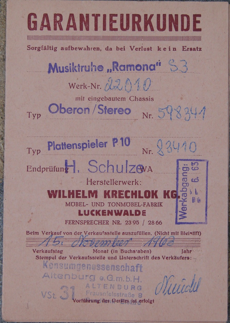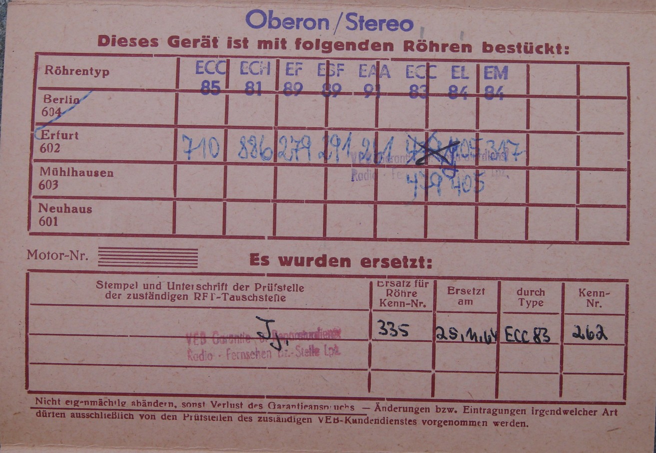 Nach damaliger DDR-Kaufkraft (1963) war die Anschaffung vermutlich so groß wie heute ein Kleinwagen, oder? Ein Arbeiter mußte sicherlich ein Jahr darauf sparen. Fast genau 1 Jahr nach dem Kauf wurde offensichtlich die ECC83 ersetzt. Allerdings hat die Ersatz-Type eine andere Kenn-Nummer, das verstehe ich nicht. Andere Charge? Anderer Hersteller? Eigenmächtiges Röhrentauschen war während der Garantiezeit untersagt. Ist aber auch verständlich, bei Bestückungsfehlern wie z.B. bei der EBF89 an Stelle der EF89 liegt die Anodenspannung z.B. an der Dioden-Anode und es wird mindestens der Entkopplungswiderstand verbrennen.