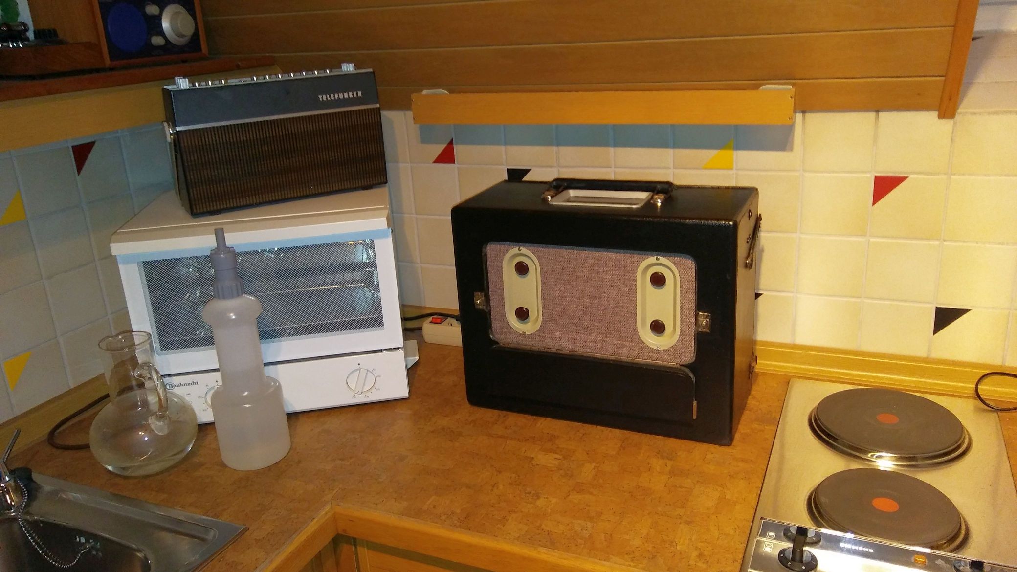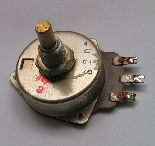 um den Körting Tourist zu vollenden, habe ich mich in Polen in vier Stoffläden umgesehen. Ich wollte schon aufgeben, da fiel mir ein Reststück von 1,6 Metern an Chenille-Möbelbezugsstoff auf, der dem Original noch am Nächsten kam. Leider machte das Lautstärkepoti erneut Probleme. Manchmal sprang die Lautstärke auf den Maximalwert und liess sich nicht mehr regeln. Ich hatte den Eindruck, dass die Benutzung der Kugellager-Kugel der Langlebigkeit der Widerstandsbahn abträglich ist, sodass ich mich zur Wiederbefüllung mit Quecksilber entschloss. Von den Bedenkenträgern im WGF nehme ich schon freiwillig und im Voraus die Schläge entgegen! Der Fehler lag in einem gebrochenen Niet am Ende der Widerstandsbahn. Sie war so wärmeunempfindlich, dass ich beide Nieten von beiden Seiten mit Lötzinn gefüllt habe.