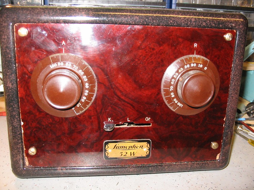 Sonst habe ich noch festgestellt, dass die Schwingungsneigung je nach eingesetzter Audion Röhre unterschiedlich ausfällt, die Handkapazität beim Einstellen stört. Möglicherweise ändert sich das, wenn das Radio wieder in seinem Blechgehäuse wohnt. Ich werde jetzt noch eine Änderung vornehmen um die RE134 zu schonen. Ich füge einen 5. Mittel-Kontakt für ein G2 in die 4er Fassung ein und verbinde das Schirmgitter über 50 K mit + um so eine RES164e ( russ.4P1L ) zu betreiben. Ich habe das bereits im Labor Versuch erfolgreich getestet. Ich habe zwar auch eine aber eben nur eine 2 SH27L die die RE134 o. Geräte Umbau ersetzen könnte, aber von den anderen habe ich 10 Stück . Alles in Allem war der 52 W sicherlich ein einfaches Gerät für den Ortsempfang. Bei dem detektorartigen Gefummle, bedingt durch fehlende Übersetzung des Drehkondensators, glaube ich, dass es nur, Zitat" der praktische Radioamateur, welcher das ABC des Radiosports beherrscht " Zitatende, betreiben wollte. Zitat ist aus der Schwarte "Der praktische Radioamateur Radiosport Broadcasting von 1924" Liebe Grüsse Jürgen H