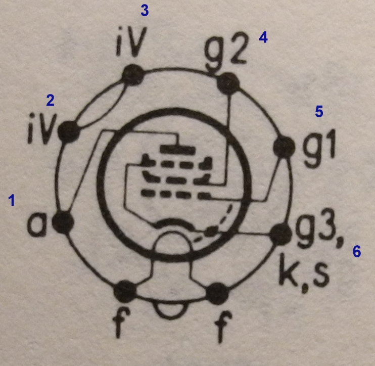 Zitieren: links und rechts von der Glas-Marke liegt die Heizung. Von unten im Uhrzeigersinn gehend kommt neben der Glasmarke kommt ein Heizstift, dann Stift 1 (Anode). Nach dieser Zählweise wäre Schirmgitter dann Punkt 4