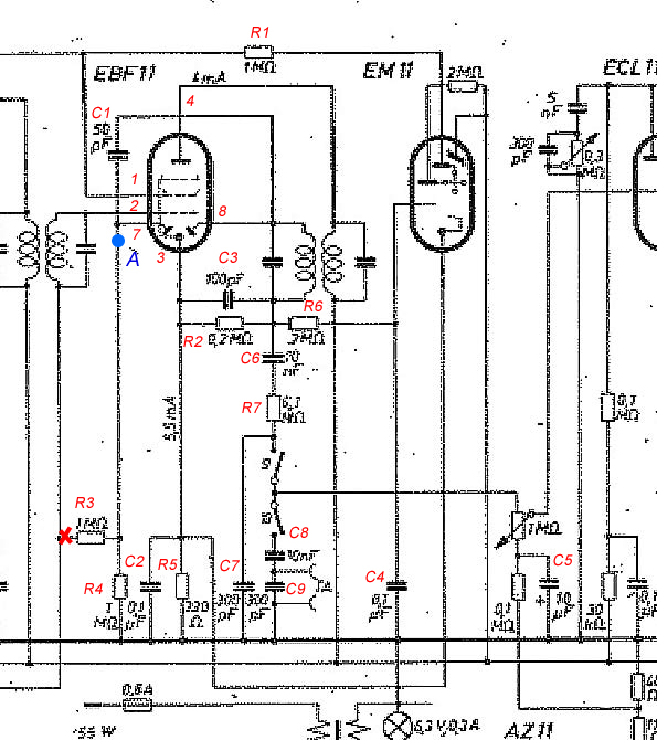 Hab mir das noch mal genauer angeschaut. Das Steuergitter, einfach mal g der EM11 hat das GLEICHE Potenzial wie die Kathode dieser Röhre. Das heißt es ist gegen Masse + positiv. Daher auch Deine Messengen mit +. Das g der EM11 ist über R6 und R2 mit der Kathode der EBF11 verbunden. Um eine negative Anzeigespannung zu erhalten muss am Knotenpunkt R3, R6, C3 eine neg. Spannung sein die Höher als die +1,26 V am g der EM11. Bei - 1 V also 1,26 + 1 =~ - 2,5 V. Diese müsste über R2 zu messen sein. An der Anode Diodenstrecke ist -. Auch wenn kein Sender zu empfangen ist, Antenne Erde gebrückt im Eingangskreis sollten - 1,5 V über R2 zu messen sein. An Punkt A wird eigentliche AVC zu messen sein. Sie sollte mind. ohne Eingangssignal bei -2 V sein am g1 H der ECH11 und der EBF11. Damit es überhaupt mal klappt könnte man R6 vom Kontenpunkt R2 C2 lösen und dort wo Du das rote Kreuz gemacht hast, bei R3 verbinden.