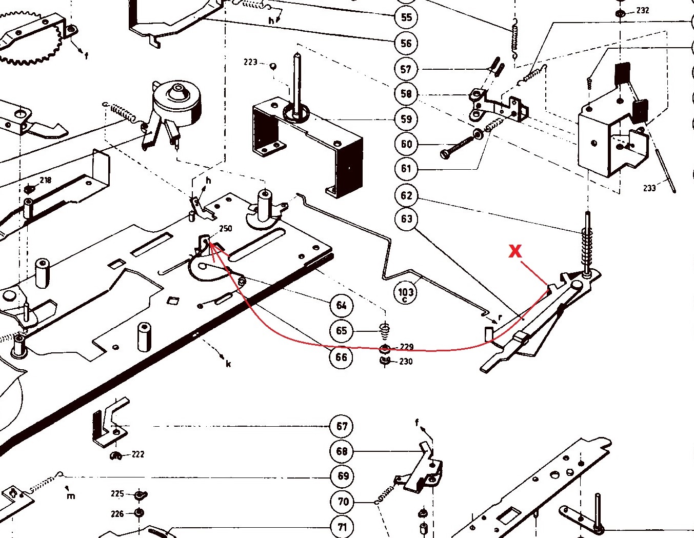 Zum Plattenspieler die „Feder104“ ist es nicht. Diese ist vorhanden und am rechten Ende (Ansicht in der Explosionszeichnung) etwas anders gebogen. Es scheint die „Feder 64“ zu sein. Das ist auch der Bereich, wo die Tonarmsteuerung stattfindet und ich das Problem vermute. Leider kann ich die Feder nicht richtig einhängen. In das Loch der Grundplatte zwar, aber nicht in das Blech/den Hebel/den „Winkel 250“. In diesem ist kein Loch, wie man es lt. Zeichnung vermuten könnte. Außerdem ist bei mir dieser Winkel in einem Winkel von ca. 45 Grad nach hinten gebogen (also eigentlich 135 Grad). Laut Zeichnung sieht es wie 90 Grad aus. An diesen „Winkel 250“ stößt ein anderer Winkel der „Zus. Platte“ Position 63 an, die mit dem Tonarm bewegt wird. Ich kennzeichne ihn in der Zeichnung mit „X“. Im Automatikbetrieb wird der Tonarm weiter ausgehoben als im manuellen Betrieb, bevor er in Richtung Plattenteller bewegt wird und „X“ geht über den „Winkel 250“ darüber. Allerdings wird dann der Ablauf durch abschalten des Motors beendet. Im manuellen Betrieb endet der Ablauf an dieser Position, da „X“ an „250“ anstößt.