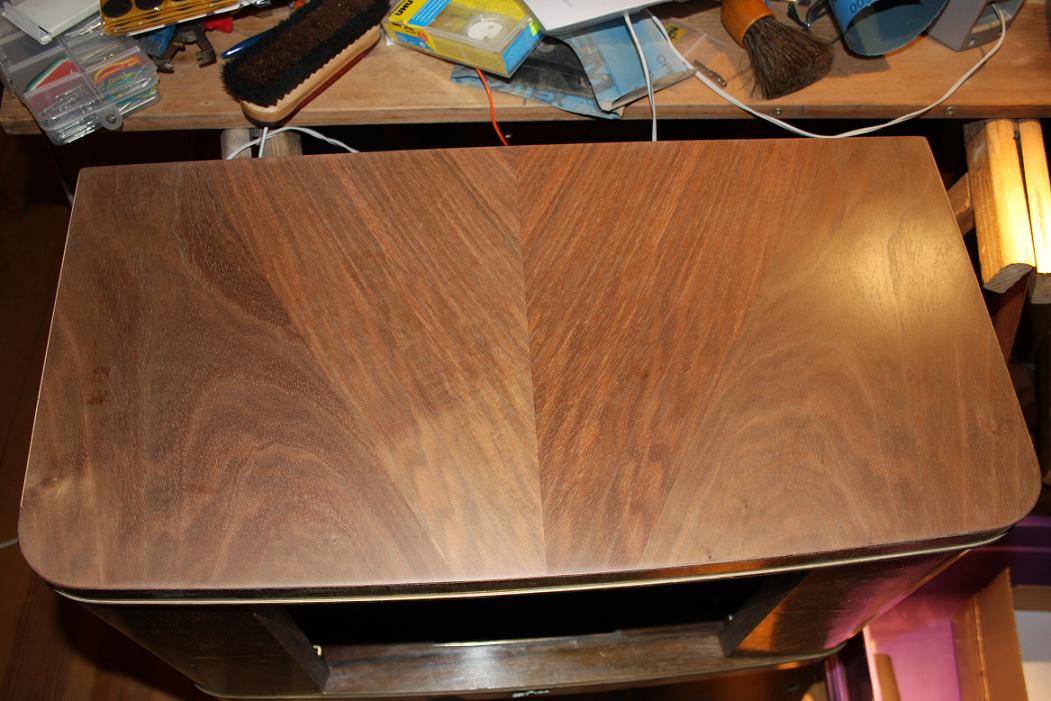 Auf das Polieren mit Bimsmehl und Ziegelmehl werde ich verzichten. Für mich ist aber der Aufwandt und das handwerkliche Können von früher nicht nur erstaunlich sondern auch erfahrenswert. Deshalb werd ich zumindest mal die obere Fläche angehen... Das Holzfurnier ist wunderschön nach dem Feinschmirgeln..siehe Foto..na man kanns noch verbessern... Schönen Abend noch vom Uli