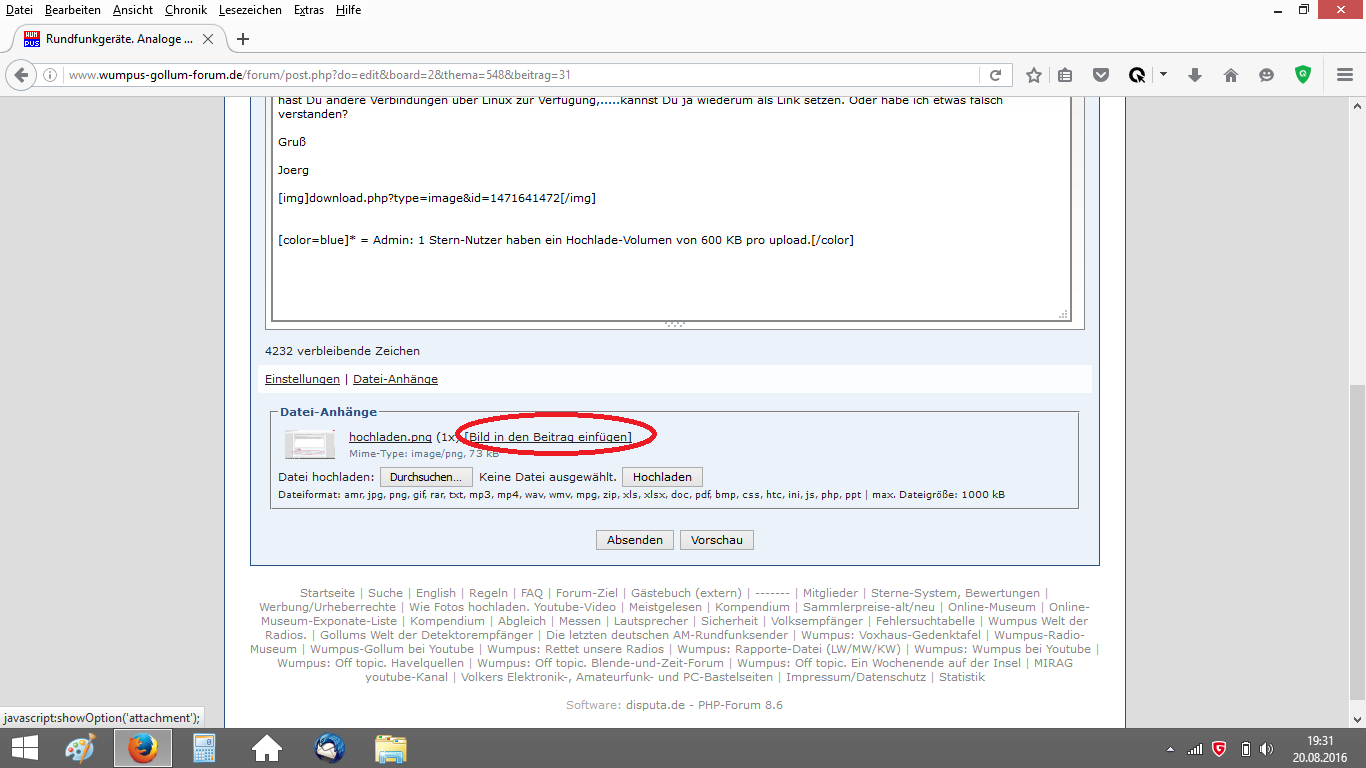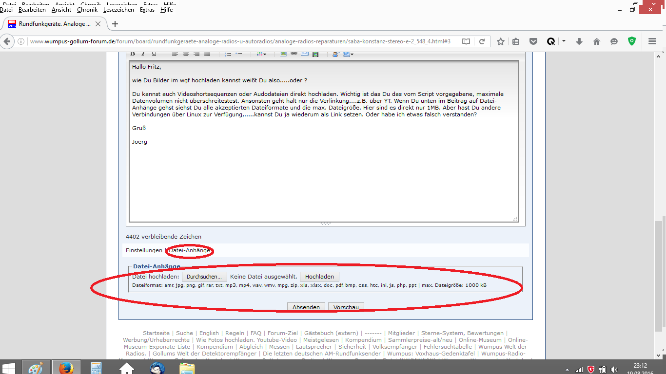 als 1x Sterne User hast Du nur 600kB. Für eine Videosequenz ist das natürlich eher zu wenig. Audio geht schon etwas. Für Bilder von Schaltplänen, Geräten, Platinen, Teilausschnitten usw..... ist das völlig ausreichend. probier es einfach mal aus. Wenn Du ein Bild hochgeladen hast, kannst Du es einfach in den gewünschten Bereich deines Textes einfügen. Beachte keine Bilder mit Urheberrechten hochzuladen. (no droits d'auteur!)