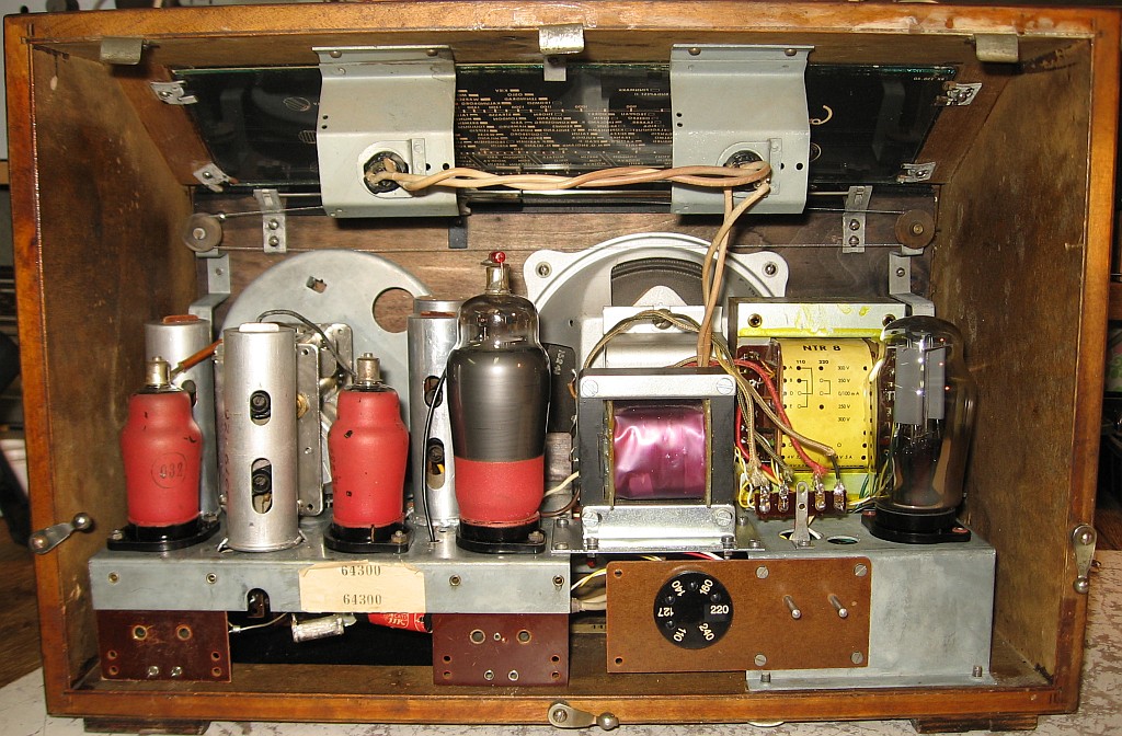 Die beiden roten Röhren, die ECH4 wurden von Philips auch als "Miniwatt" Röhren bezeichnet, ist auf dem Foto noch zu erkennen. Mein Philips Saturn 51 ist da noch viel "Servicefreundlicher". Bei diesen Geräten wird nicht wie später zwischen Chassis und Gehäuse eine Trennung gemacht in dem Sinne das das Chassis in einem Rutsch herausgenommen werden kann. Skala und Skalenzeiger sind Bestandteil des Gehäuses Viele Kondensatoren waren gut versenkt im Chassis, diese Tauscherei hat über 5 Std. gedauert.