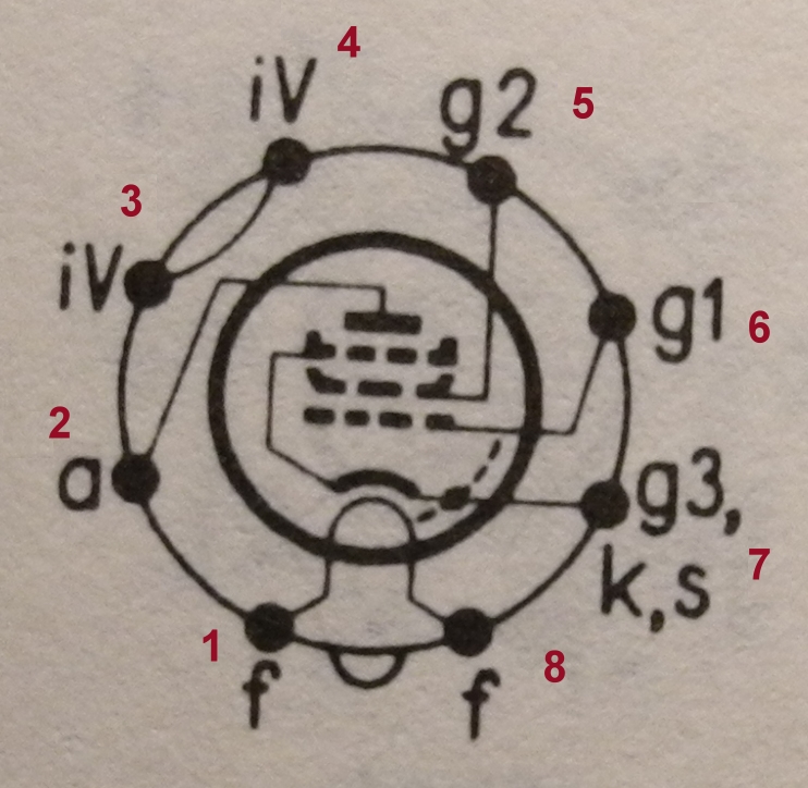 Punkt 2 Anode Punkt 5 Schirmgitter Punkt 6 Steuergitter (hier sollte eine geringe negative Spannung anliegen (Ist abhängig von Deinem Meßinstrument).