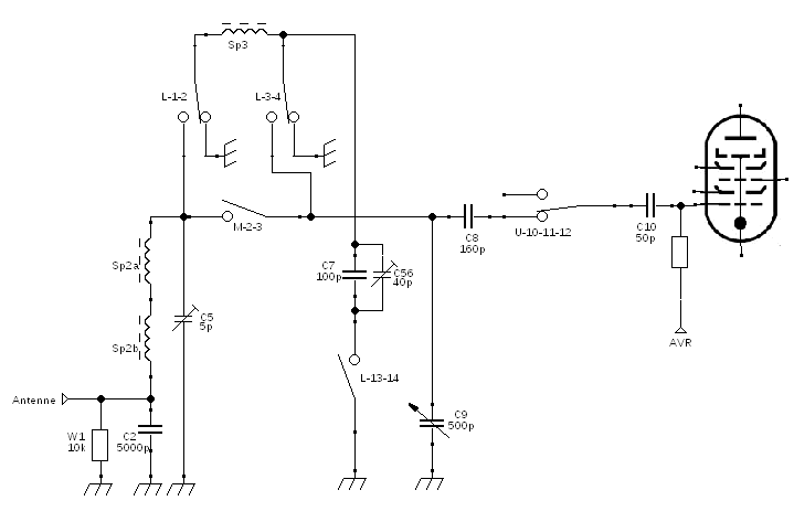 2a.) Bei Bereichsumschaltung auf MW wird die LW-Verlängerungsspule Sp3 ja eigentlich (wie beim Volksempfänger) durch Schalter M-2-3 überbrückt. Warum wird Sp3 noch zusätzlich durch die Umschalter L-1-2, L-3-4 komplett vom Schwingkreis getrennt und beidseitig geerdet?