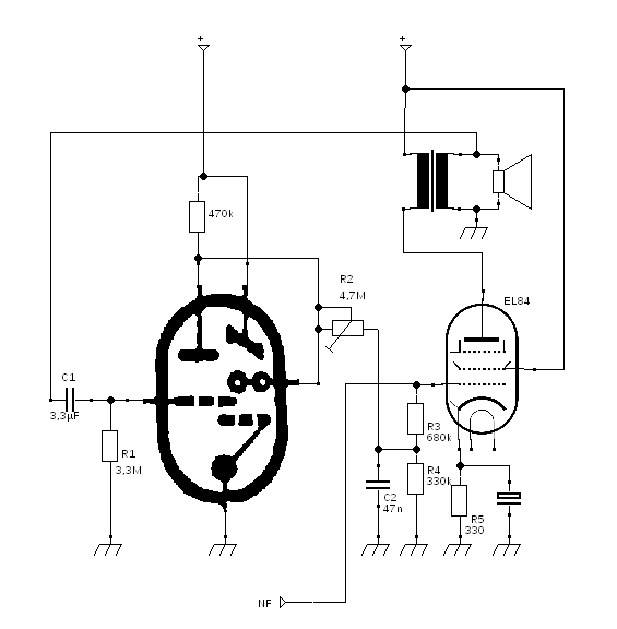 Erklärung der Schaltung anhand eines Mono-Gerätes: Der Katodenwiderstand R5 wird so hoch gewählt, daß die EL84 ohne Signal nur noch mit halben Anodenstrom läuft. Die AÜ-Sekundärwicklung wirkt auf die Audion-Gitterkombination C1/R1 der EM84, welche eine extrem große Zeitkonstante besitzt. Das führt dazu, daß NF-Wechselspannungen (auch kurze Impulse) das Triodengitter der EM84 zustopfen und diese Zuregelung auch ohne Signal viele Sekunden anhält. Abhängig vom Grad der Zuregelung steigt die Anodenspannung der EM84-Triode, und über den Spannungsteiler R2/R4 wird diese Regelspannung dem Fußpunkt des Gitterableitwiderstandes der EL84 R3 zugeführt, wo sie der an R5 abfallenden Gittervorspannung entgegenwirkt. R2 ist so abzugleichen, daß bei maximaler NF-Aussteuerung der Anodensrom der EL84 auf den Nennwert steigt, dieser aber nicht überschritten wird. C2 beseitigt eventuelle NF-Reste, macht aber auch das Ansprechverhalten der Schaltung träger. In der Stereoversion wird die EM84 für beide Stereokanäle genutzt und die beiden Kanäle werden am Audioneingang möglichst übersprecharm addiert.