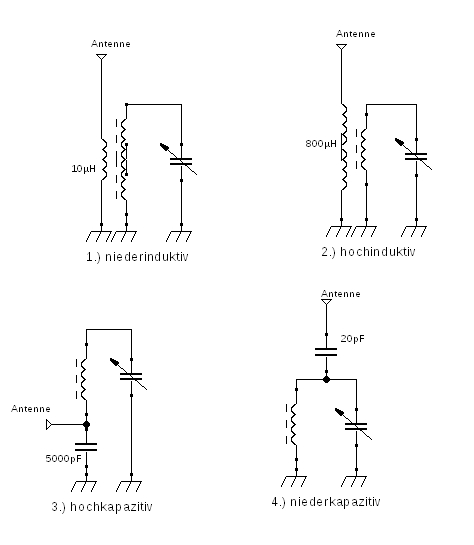 vielen Dank für Deine Ausführungen. Diese Art der Antennenankopplung kannte ich bisher nicht, aber die Vorteile klingen sehr einleuchtend. Korrekterweise muß sie "hochkapazitiv" bezeichnet werden, als Pendant zur niederinduktiven Ankopplung. Kann es sein, daß diese Art der Ankopplung wenig verbreitet war? Ich habe sie mal in eine Systematik aufgenommen, die somit aus 4 Hauptarten besteht, mit beispielhaften Kapazitäts/Induktivitäts-Angaben für MW: