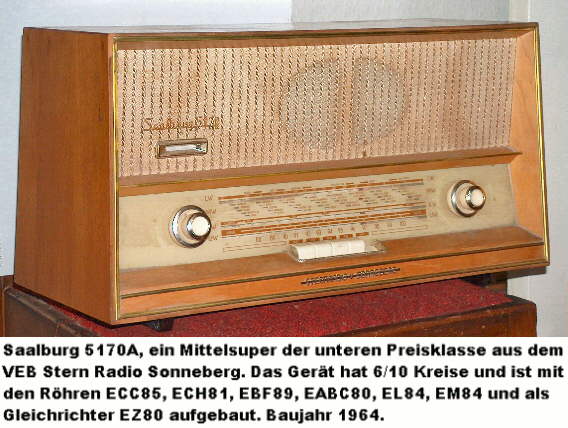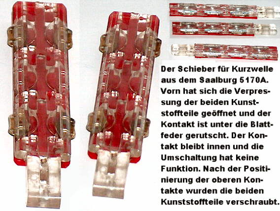 Der Empfänger "Saalburg5070" wurde Anfang der sechziger Jahre vom VEB Stern Radio Sonneberg hergestellt. Das Gerät ist ein Mittelsuper der unteren Preisklasse, mit einem Breitbandlautsprecher bestückt und unter Verwendung standardisierter Baugruppen entwickelt worden. Zu diesen Baugruppen gehören der induktiv abgestimmte UKW- Tuner, das Netzteil und die HF- NF- Leiterplatte. Diese Baugruppen sind auch in anderen Modellen aus Sonneberg zu finden. Nach einiger Betriebszeit wurde der Ton verzerrt und die Endröhre EL84 bekam rote Bäckchen. Richtig geraten, der Koppelkondensator, ein Gewaplasttyp (Genau so gut, wie seine Geschwister von Wima), hatte Feinschluß. Nach dem Ersatz dieses und weiterer drei Kondensatoren spielte das Gerät auf UKW, AM- Empfang war aber nicht möglich. Nur dann, wenn man die Antenne direkt in den Vorkreisdrehko einspeiste, war ein Empfang möglich. Die Ursache für diesen Fehler war die Taste "Kurzwelle". Der Kontaktschieber war mechanisch auseinander gegangen und der Kontakt war unter die Blattfeder gerutscht, die normalerweise den Kontaktdruck herstellt. Nach dem Ausbau des Kontaktschiebers war der Fehler sichtbar. Abhilfe wurde durch das Eindrehen von zwei kleinen Schrauben (M1,4) geschaffen. Grundsätzlich wäre auch Kleben möglich. Muß man den Schieber aber erneut öffnen, z. B. weil Kleber nach innen gelaufen ist, hat man ein Problem. Nach dem Zusammenbau des Tastensatzes spielte das Gerät auch wieder einwandfrei in den AM- Bereichen.
