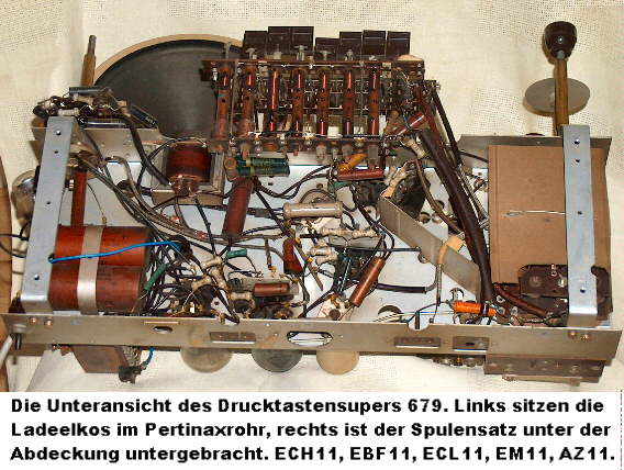 Hallo liebe Forumnutzer. Vor einiger Zeit reparierte ich einen Drucktastensuper des Typs 679WK, hergestellt 1939 von der AEG. Äußerlich machte das Gerät einen guten Eindruck und wurde in seinem Leben ausgiebig genutzt. Der in dem Gerät verbaute Röhrensatz war noch original und bot keinen Anlaß zur Beanstandung. Erforderlich war bei dem Gerät eine Reparatur des Seilzugs. Der Skalentrieb ist bei diesem Empfänger zweiteilig aufgebaut. Ein textiles Skalenseil übernimmt den Antrieb des Seillaufrades über den Abstimmknopf, ein Stahlseil mit dem Durchmesser von 0,22 mm übernimmt den Transport des Zeigers. Dieses Seil war lose im Gerät und hatte sich teilweise in den Wellenschalter hineingezugen. Ursache für diesen Fehler war eine Umlenkrolle. Diese war mit einem Winkel an das Chassis genietet. Die Niete hatte sich herausgezogen und damit lagen Niete und Stahlseil lose im Gerät. Eine weitergehende Untersuchung gab Aufschluß für den Grund. Der Zeiger wird durch eine Führungsstange innerhalb des Gehäuses geführt. Diese hatte Rost angesetzt und den Zeiger blockiert. Die beim Drehen des Abstimmknopfes auftretenden Kräfte zogen die Umlenkrolle aus ihrer Vernietung. Mit einer Schraube war das Problem beseitigt und das originale Seil für den Zeigertransport konnte wieder aufgelegt werden. Nachdem das Gerät in Betrieb gesetzt wurde, war ein guter Empfang auf allen drei Wellenbereichen vorhanden. Der Wellenschalter und das Drucktastenaggregat hatten nur geringe Kontaktprobleme, die mit Kontaktspray beseitigt werden konnten. Nach einiger Zeit war die Wiedergabe verzerrt. Der Koppelkondensator hatte einen Isolationsfehler und mußte ersetzt werden. Das blieb aber der einzigste elektrische Fehler. Selbst die Elkos im Netzteil hatten noch ihre Kapazität. Damit konnte die Arbeit an dem Gerät abgeschlossen werden. Die Urheberrechte an den Bildern habe ich.