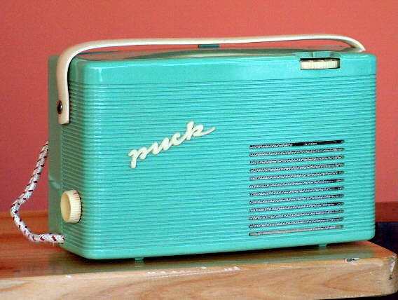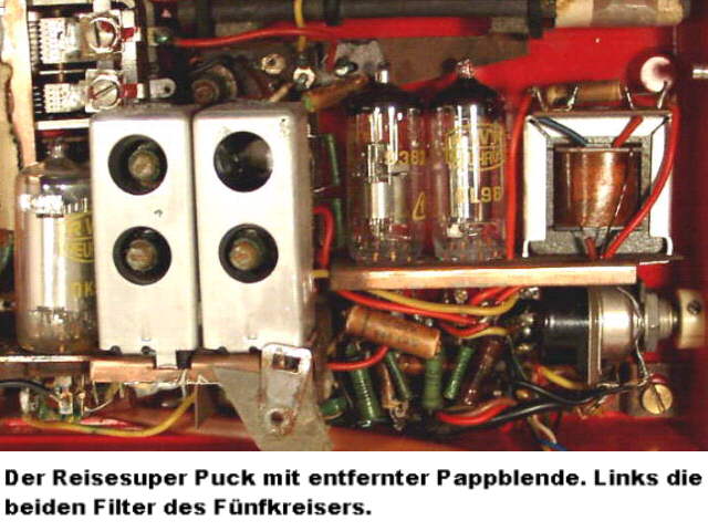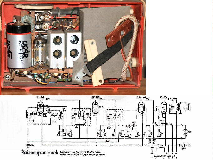 Der nur für den Empfang der Mittelwelle ausgelegte Koffersuper "Puck" war das kleinste und letzte röhrenbestückte Kofferradio aus dem Funkwerk Halle. Das Gerät ist mit vier Röhren bestückt, der zur Abstimmung eingebaute Luftdrehko findet sich im transistorisierten Taschensuper T100 wieder. Die Anodenbatterie konnte durch das optional erhältliche Netzteil des Sylva aus dem gleichen Betrieb ersetzt werden. Nach dem Einschalten war kein Empfang möglich. Die "Brummprobe" ergab, daß der NF- Verstärker arbeitete. Nun wurde versucht, durch Spannungsmessung an den Röhren den Fehler zu finden. Vorsicht hierbei, die Technik ist auf Grund der Anodenspannung "bissig". Am Schirmgitter der Röhre des ZF- Verstärkers fehlte die Spannung. Nach dem Ersatz des hochohmig gewordenen Widerstandes war das Gerät wieder in Ordnung. Die im mittleren Bild sichtbare Steckerleiste dient zum Anschluß des Netzteils.