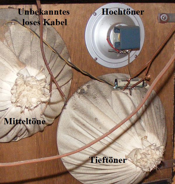 Sind der Tief- und der Mitteltonlautsprecher vom gleichen Typ? Das ist aus dem Bild nicht sicher zu erkennen. Vom Anschlußschema her würde ich sagen, daß beide Lautsprecher in Reihe geschaltet sind. Der Hochtonlautsprecher wird in Reihe mit dem Kondensator dazu parallel geschaltet. Eine Frage zum vorigen Thread. Auf der Darstellung des Chassis ist eine Röhre UABC80 eingetragen. Ist eventuell die EABC80 gemeint oder steckt dort wirklich eine U- Röhre? Chassis: 653W, Musiktruhe Imperial 9000W, Hersteller Continental Osterode, Baujahr etwa 1953.