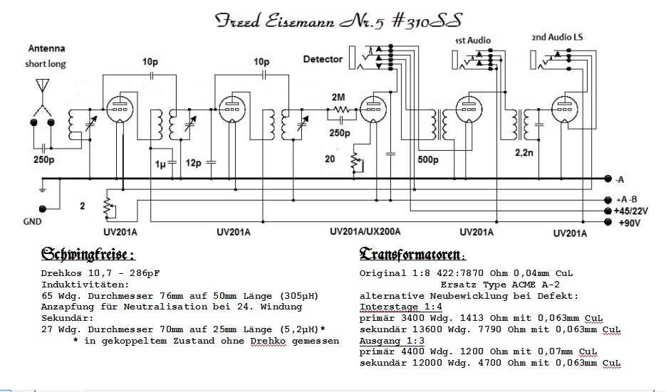 Zurück zum Freed-Eisemann für den betuchten Amerikaner (Nr5=150$) seinerzeit. Reflexempfänger hatte man hier nicht nötig. Die vielen Ausführungen, die man in einer Art "Understatement" im schnörkelosem Standart- Voll-Mahaghonigehäuse 21 x 21 x 71 cm in diversen (Versions)Nummern aufreihte, unterschieden sich in der Röhrenzahl von 5 bis 7, mal mit gasgefüllter Detektorröhre, eigenem Rheostat und 22,5V Anodenspannung, mal mit normalen UV-201A, mal mit hohen Anodenspannungen bis 135V und C-Batterie für die negative Gittervorspannung, auch schon mal mit 2 parallelen Endröhren. Zur Steigerung der Ausgangsleistung konnte ab 1926 auch eine einzelne Endröhre des Typs 71A verwendet werden, wenn das Gitter eine negative Vorspannung von über 20V erhielt. Bei nur 4,5V Vorspannung wäre eine UX112 (200mW Audio Output) ideal, ist aber schwer zu beschaffen. Parallelen zu hiesigen Leistungsröhren aus dieser Zeit drängen sich auf.