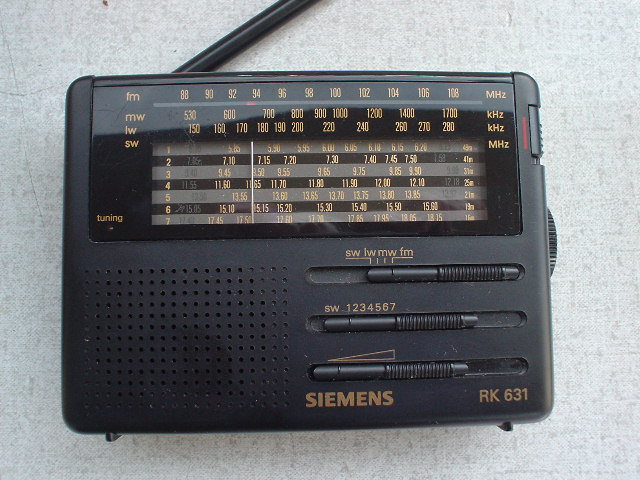 Ein RK 631 von Siemens Bj. 1991 FM MW Lw SW in 7 Wellenbereichen von 5,85Mhz. - 18,15Mhz Zeigerskala Tuningdiode Ohrhörereingang 3Volt Eingang Größe: 14,5cm x 10cm x 4cm