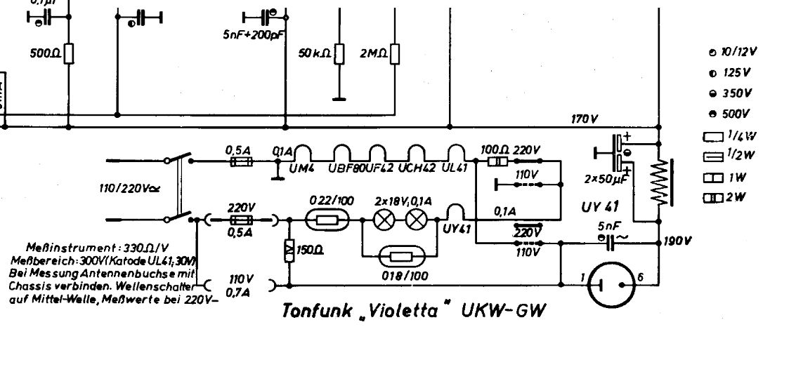 Zuerst ein herzliches Willkommen hier im Forum. Zu Deinen Vorkenntnissen und technischen Möglichkeiten brauche ich keine Fragen zu stellen. Die UY41 ist ja bei diesem Gerät durch eine Diode ersetzt worden. Der Heizkreis müßte also ebenfalls durch einen Widerstand entsprechend der Heizspannung der Gleichrichterröhre ersetzt worden sein. Anbei ein Schaltungsausschnitt des Heizkreises der Violetta UKW GW. Damit müßte die Einstellung der Netzspannungswahl erkennbar sein.