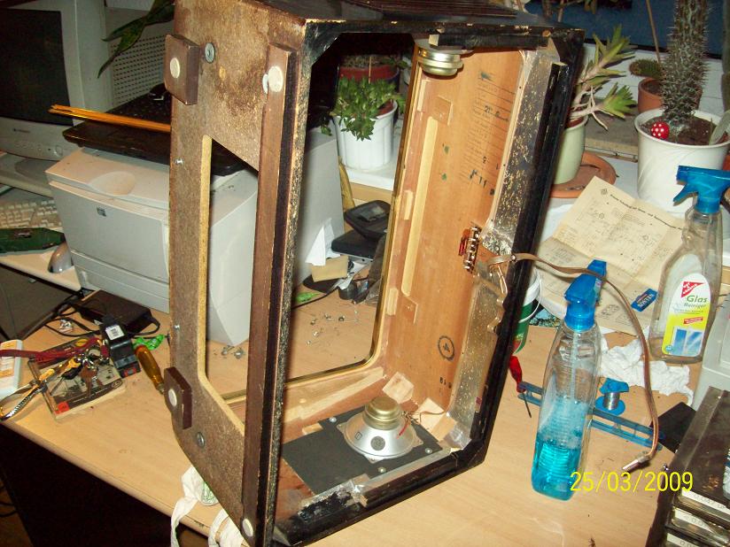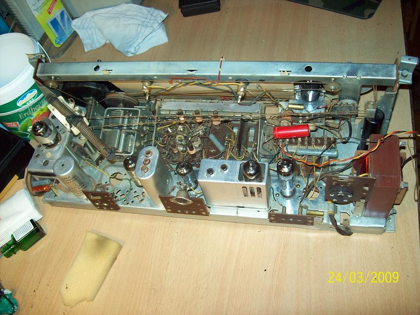 Hier: Bilder der Kernsanierung, (alles raus, saubermachen, wieder rein), Kondensatoren hat er schon frische, das Gehäuse ist poliert, eine neue EL84, Zusammenbauen mit anschließender kleiner Nachtmusik -jetzt klingt er so wie er aussieht: pieksauber.