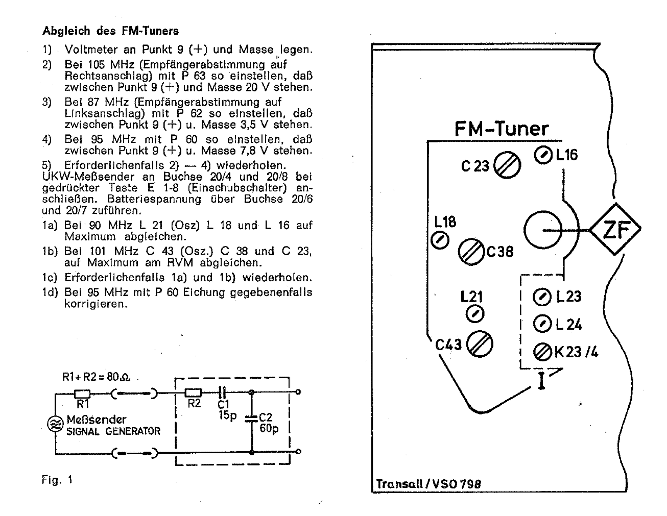 Zum Abgleich des Tuners kann ich Dir nur einige allgemeine Hinweise geben. Der Trimmkondensator des Oszillatorkreises ist so einzustellen, daß ein Sender um 104 MHz empfangen werden kann. Dann ist zu kontrollieren, was um 88 MHz empfangbar ist. Hier wird dann mit der Spule korrigiert. Der Tuner hat zwei abgestimmte Eingangskreise. Diese werden in gleicher Weise auf optimalen Empfang abgeglichen. Auch hier bei 104 MHz mit dem Trimmer, bei 88 MHz mit der Spule. Dieser Vorgang wird wechselseitig wiederholt, bis ein optimales Ergebnis erreicht ist. Da die Version Transall de Luxe E den gleichen Tuner verwendet, habe ich eine Kurzform des Tunerabgleichs hinzugefügt. Der Meßsender heißt bei uns dann Rundfunksender um die angegebenen Frequenzen.