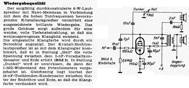 Hallo Wolfgang, dann ist das die Lösung. Der Andante hat einen Kristall-Hochton-Lautsprecher. Wie Du schon erwähnt hast, kann man das am Schaltbild so nicht erkennen. Das sieht im ersten Anschein nach einem Kondensator-Lautsprecher (Elektrostaten) aus - obwohl: Zumeist wird ja Elektrostaten auch eine Gleichspannungs-Komponente zugeführt, die hier ja fehlt. Erst die Schaltungsbeschreibung schafft völlige Klarheit. Die Kristallhörer waren im Vergleich zu den elektrostatischen Lautsprecher selten im Einsatz. Sogesehen ist der Andante eine Besonderheit.