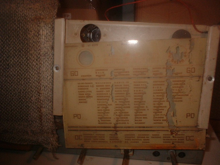Es ist eine Abstimmanzeigeröhre AM2 von Dextron verbaut, auf der Frontplatte oben steht No 636, Plan de Cairo. Neben der Bereichswahl Po, Go, OC besteht noch die Wahl des TA-Eingangs B/PU. Gleichrichterröhre wahrscheinlich AZ1. Weitere 4 Außenkontaktsockel, daher meine Vermutung vor 1941. Der Netzspannungsumschalter ist typisch für französische Geräte.