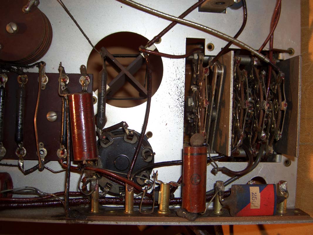 Der Trafo könnte eine Siebdrossel sein. Das beißt sich zwar mit der Angebe im RM, daß ein elektrodynamischer Lautsprecher eingebaut ist, aber auch im RM darf man nicht alle Angaben kritiklos glauben. Leider ist auf den Bildern von Friedrich die Ausführung des Lautsprechers nicht eindeutig zu erkennen. Beim Einsatz von Netztrafos im Radio gibt es drei Möglichkeiten. Der Netztrafo stellt nur über die Sekundärwicklung die Heizspannung bereit, die Anodenspannung kommt aus dem Netz. Der Netztrafo ist als Spartrafo aufgebaut und dient mit Abgriffen der Primärwicklung zur Heizung der Röhren. Die Anodenspannung kommt direkt aus dem Netz. In beiden Fällen haben wir ein nicht!!! netzgetrenntes Gerät, welches wie ein Allstromgerät mit der gebotenen Vorsicht zu betreiben ist. Ein Vorteil dieser Lösungen ist, daß die Anodenspannung über die Primärwicklung hochtransformiert werden kann. Das sichert auch bei 110 Volt Netzspannung die volle Leistung des Empfängers. Die Bereitstellung aller Betriebsspannungen wird über Sekundärwicklungen eines Netztrafos realisiert. Diese Geräte haben keine galvanische Verbindung mit dem Netz, sind also vollständig netzgetrennt. Diese Netztrennung ist die notwendige Vorraussetzung zum gefahrlosen Betrieb von Bandgeräten, Plattenspielern oder anderen Signalquellen am Radio.
