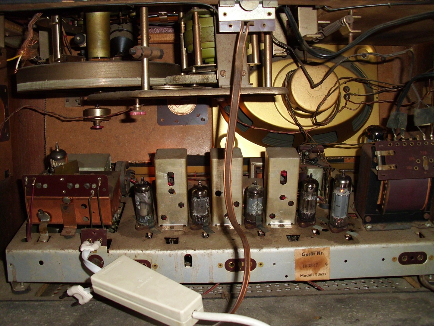 Habe ein Bild aus einer Museumsammlung übrigens hier in der Nähe gefunden . Dort ist das Gerät ohne Rückwand zu sehen . Also ganz unverbindlich würde ich von hinten gesehen von rechts nach links meinen erst EL 84 ( direkt neben dem Netztrafo ) dann EABC 80 , EF 89 , EF 89 , ECH 81 und die ECC 81 etwas weiter links vorne auf dem UKW Teil . Die EM 80 ist klar , die sitzt hinter dem Skalenglas bei dem Abstimmknopf . Diesen Aufbau haben sehr viele Radios aus der Zeit .