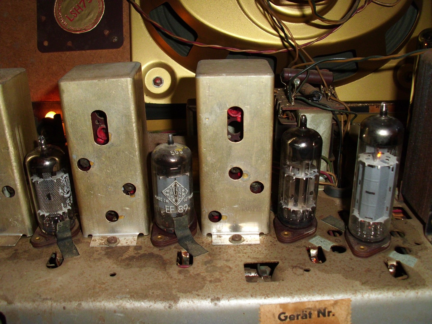 Ich meinte die Perspektive von hinten . Also Rückwand ab und den Blick auf das eingebaute Chassis von der Rückseite . Direkt links neben dem Netztrafo der dann ja rechts ist die EL 84 ( NF - Endröhre ) . Dann weiter nach links in Richtung Antennenbuchse EABC 80 ( AM + FM Demodulator NF Vorverstärkung ) EF 89 und EF 89 ( ZF Verstärker ) ECH 81 ( AM HF , AM Mischer , 1 . FM ZF ) ECC 81 auf dem Kupferfarbenen Gehäuse ( UKW Vorstufe , Mischer ) . Die EM 80 ist ja klar . Bei RM Org ist mir aufgefallen das die Reihenfolge der Röhren oft nicht mit der Wirklichkeit übereinstimmt z .b. eine Netzteil - Gleichrichterröhre als zweite in der Reihenfolge nach einer HF Vorstufenröhre steht . Die Bestückung als solches stimmt . Es kann eigentlich nicht anders sein , fast alle Röhren liegen auf einer Linie , ich habe die Reihenfolge von NF zu HF , vom Lautsprecher zur Antenne gewählt .
