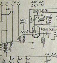 Nachdem ich gute und stabile Werte (unter 30 mA) über dem ersetzten 1 kOhm (2W) gemessen und am ersetzten zweiten Siebelko auch etwa Sollspannung (250 V) hatte, meinte ich, das passt schon. Dann habe ich geprüft, ob die Oszillatorstufen schwingen. Dazu (ohne Antenne) die Messspitze vom Oszilloskop in die Nähe der Drucktastenreihen gehalten: Ja, alle AM Stufen (LW, 2x MW, 3X KW) schwingen und lassen sich durchstimmen, große Freude! Mit UKW gings noch einfacher: Taschenempfänger in 1 m Abstand auf Rauschen gestellt und am Grundig durchgestimmt - ja super Empfang, stabil, nichts läuft weg. Das Magische Auge hat zwar altersschwache Leuchtkraft - aber immerhin. Allerdings hätte dennoch die ECL 11 abgeraucht sein können, Glück gehabt.