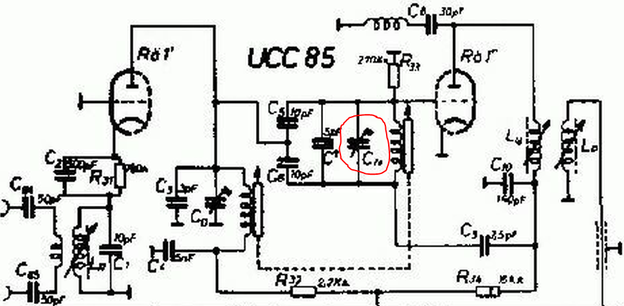 Aber eine Grundsatzfrage: Hat die ECC85 einen Einfluss auf besagtes Problem, bzw. muß ich den Abgleich nach einem Röhrentausch abermals vornehmen? Welchen Zweck hat der Stell-ko "Cd" in meinem Schaltplan? Bin HF-technisch leider sehr unbedarft, aber was noch nicht ist, kann ja noch werden ;)
