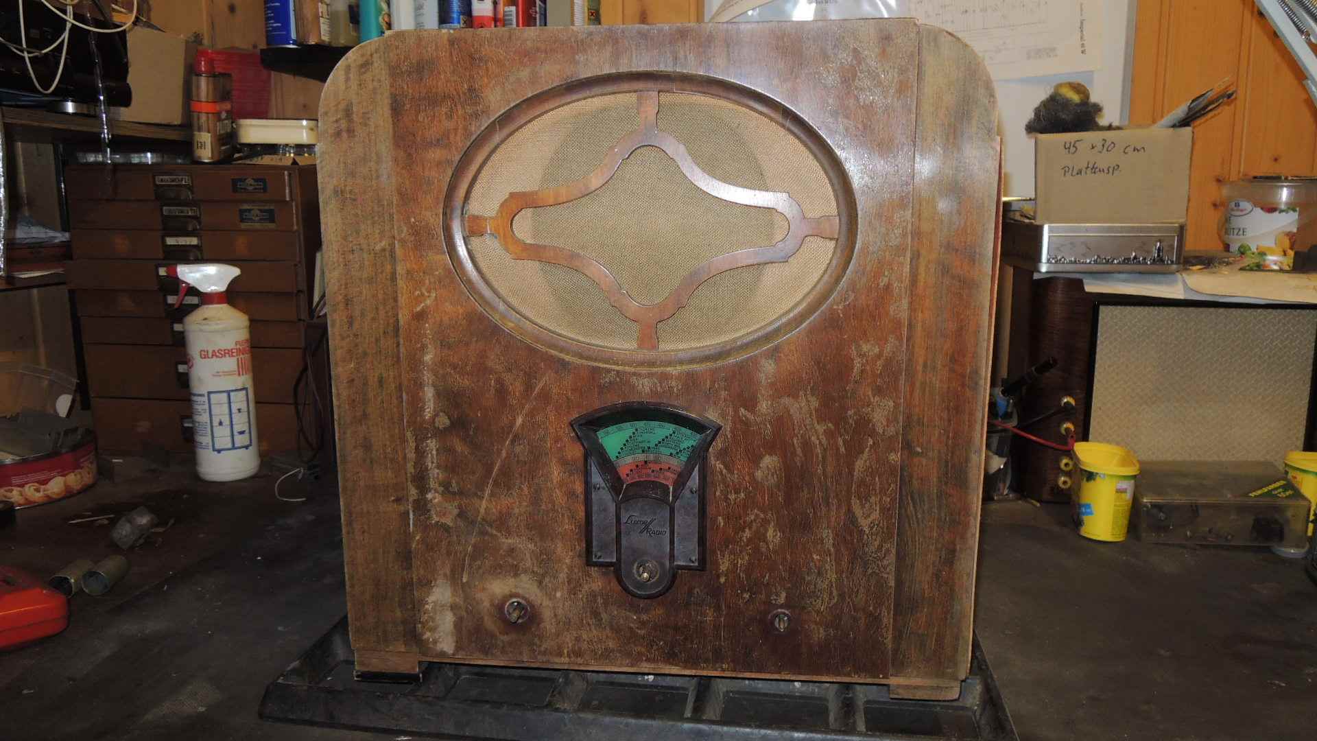 im Frühjahr entdeckte ich bei *(W)* für recht wenig Geld ein interessantes schwedisches Luxor Radio. Viele Bieter hatten wohl etwas Angst vor dem Zustand des Gehäuses. Das Innenleben ging zwar, war aber unterhalb des Chassis etwas verbastelt. Trotzdem habe ich mir das Radio ersteigert. Das war doch ein recht schwerer Klotz. Das Gehäuse war in seine Einzelteile zerfallen. Ganz tückisch das Furnier war sehr locker. Teilweise auch das Unterfurnier. Hier war erstmal Leimen angesagt. Man kann rechts bei genauem Hinsehen auf dem Bild noch erkennen, wie das Furnier so locker war.