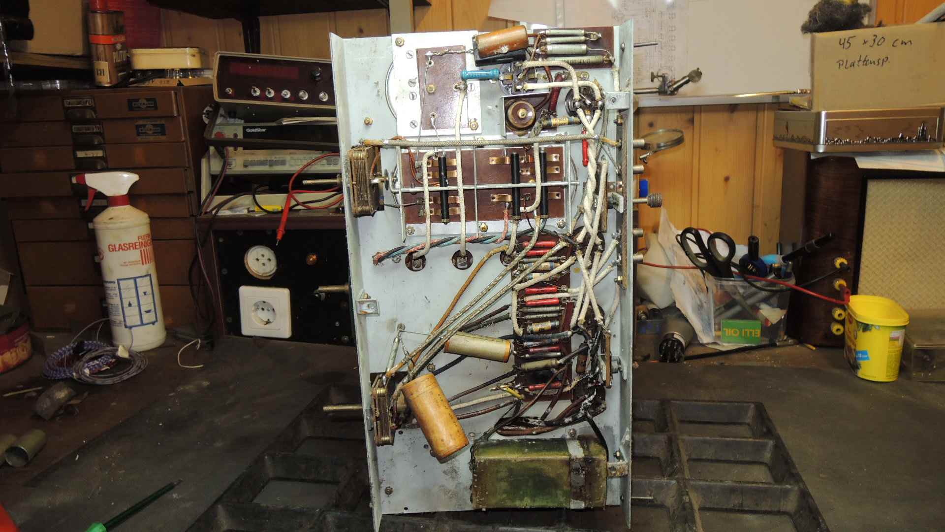 Die Verbastelungen wurden beseitigt, die Kondensatorhüllen neu verfüllt. Als Ersatz für den großen MP-Kondensator habe ich 2 Holzlattenhälften verwendet und dort zwei neue Netzelkos eingelassen. Dann dünne Pappe drum kleben. Nun habe ich grünes Geschenk-Papier um den Kondensator geklebt. Fertig war der Kondensator. Die 3 metallisierten Röhren haben etwas gekoppelt, weil die Abschirmungen lose waren. Hier wurde unterhalb etwas Litze um den Abschirmmantel gewickelt. Das alte original Drahtgeflecht schön blank schleifen. Nun kommt etwas Zweikomponentenkleber drüber. Danach war das Koppeln vollständig beseitigt. Die Metallabschirmungen waren insgesamt am Abblättern. Da sie vorhanden waren, konnte hier mit Zapponlack stabilisiert werden. Wie Ihr seht, ist nichts mehr sichtbar. Das Radio hat vorne links die Rückkopplung. Rechts befindet sich der hochfrequente Lautstärkenregler (Drehko). Durch ihn geht eine Achse, die zum Wellenschalter führt. Zieht man, kommt die Langwelle und schiebt man rein, wird die Mittelwelle geschaltet. Auf der Skala wechseln dann die entsprechenden Lämpchen, die farblich sind. Das schöne Radio ist mittlerweile schon eine Augenweide. Aber das schreibe ich Euch dann heute abend oder morgen weiter. Jetzt seht erstmal die Bilder. Noch ein Hinweis: Der Ton ist umwerfend. Allein wegen des Gehäuses. Das Gerät ist übrigens ein Dreikreiser mit Rückkopplung!