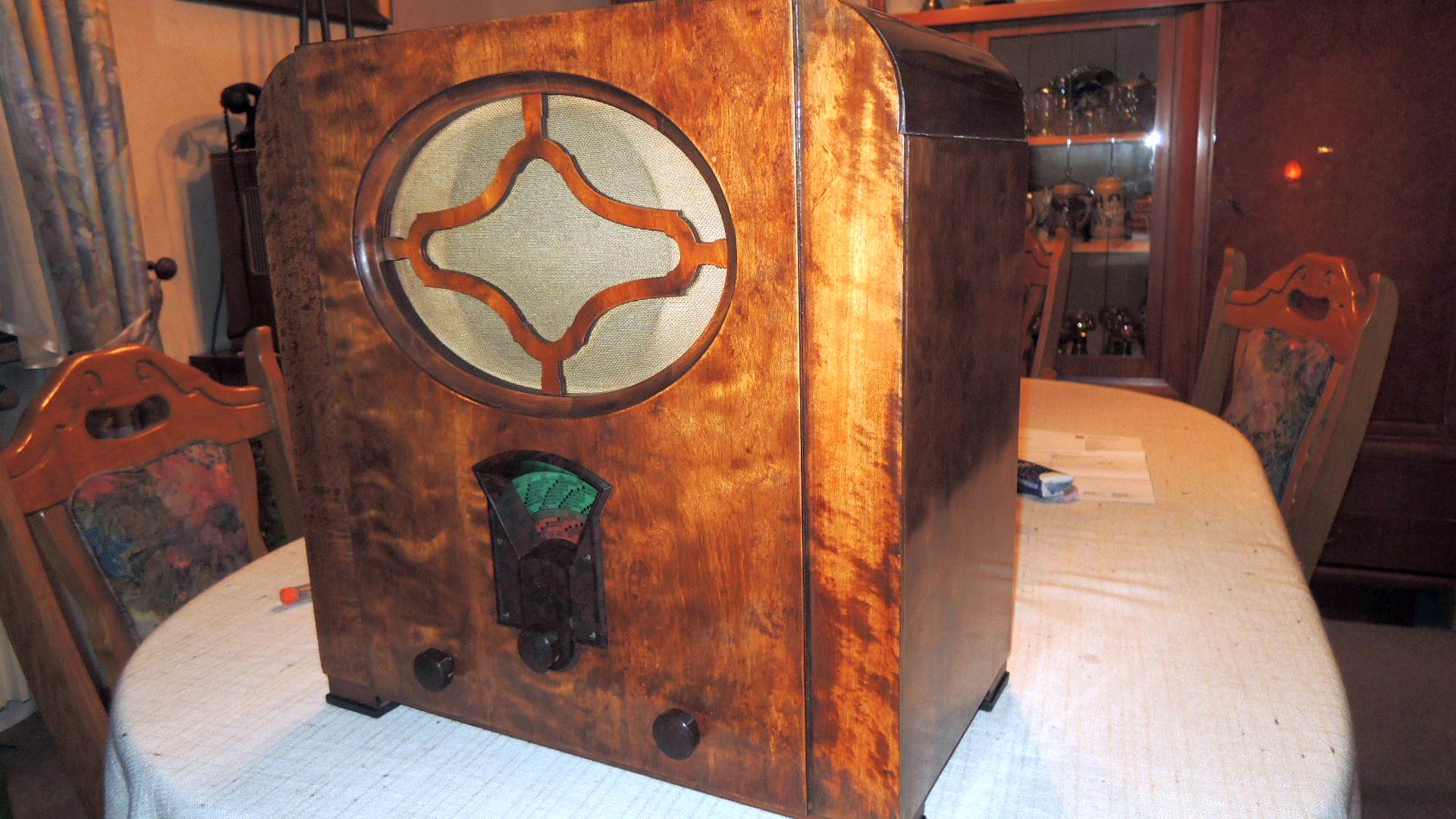 heute möchte ich Euch meinen fertig gestellten Luxor 534 vorstellen. Vieles hatte ich ja vorab schon geschrieben. Das Gerät ist - wie gesagt ein Dreikreiser mit einer RENS1284 und zwei REN904. Versteht sich eine RENS964 und eine RGN1064 zur Gleichrichtung gehören auch dazu. Die Feldspule vom Lautsprecher besitzt 12 Kiloohm und wird parallel zum Netzteil geschaltet. Die damals vonm Versteigerer beigelegte Kunststoffolie vom Spannungswähler sitzt nun auch am richtigen Platz. Der Lautsprecherstoff wurde nicht weiter gereinigt, weil er noch gut ist. Hätte ich ihn verwaschen, dann hätten mit Sicherheit die im Laufe der vielen Jahre im Stoff entstandenen Konturen an anderer Stelle gesessen. Das ist so vermieden. Was auch schön ist, die Rückwand ist original und der Bestückungsplan der Röhren ist auch noch mit drauf. Die Rückwand wurde nur mit etwas Möbelpolitur bearbeitet. Das Gehäuse konnte auch wieder völlig in Form gebracht werden. Ich habe es deshalb von allen Seiten fotografiert. Wie ich geschrieben habe, war der Deckel abgegangen, ebenso die beiden Rundhölzer links und rechts. Die Kunst war nun, alles wieder so in Form zu bekommen, dass nichts übersteht , was an anderer Stelle fehlt. Das war wirklich nicht einfach. Beim furnier gab es unterschiedliche Lockerungen. Teilweise war das Unterholz angelöst, vielfach nur das Furnier. Die Klebearbeiten waren sehr umfangreich und es mußte stets nachgearbeitet werden. Übrigens sind die beiden Rundungen oberhalb nicht furniert. Das Holz hatte zwar die entsprechende Flammung, wurde aber durch Schellack-Entfernung und Schleifen ganz hell. Diese mußten farblich dem Furnier angeglichen werden. Das hat aber auch gut geklappt. Zu hell wäre dumm, zu dunkel aber auch. So hat das Gerät wieder seine durchgängig geflammte Optik. Diese gefällt mir an dem Radio sehr gut. Das Einzige, was wohl nicht ganz paßt, ist der Gerätestecker hinten. Von den Anschlußsteckern kommt es ja hin, aber der war mit Sicherheit anders geformt. So, nun zeige ich Euch mal die Bilder, ich hoffe, Ihr seit auch zufrieden.