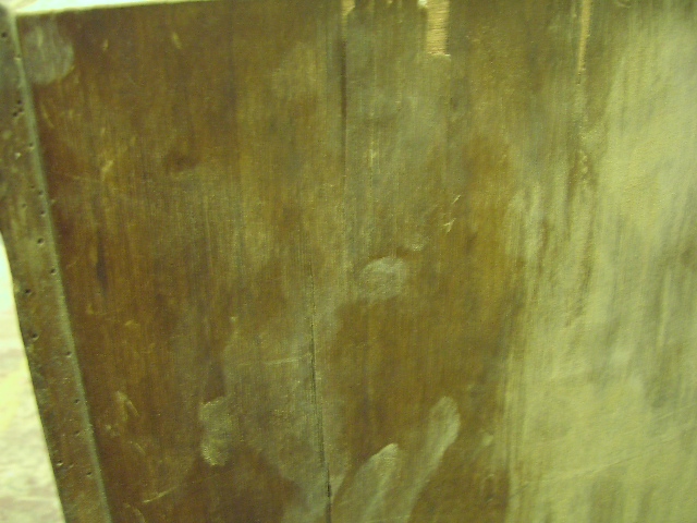 Durch die Maserung des neuen Furniers muß man schon beide Streifen ersetzen. An der Vorderfront hat das Furnier kleinere Falten geschlagen. Hier hat der Leim nachgegeben. Seitlich rechts ist das Furnier in der Mitte sehr lose. In der Mitte ist ein Riss.