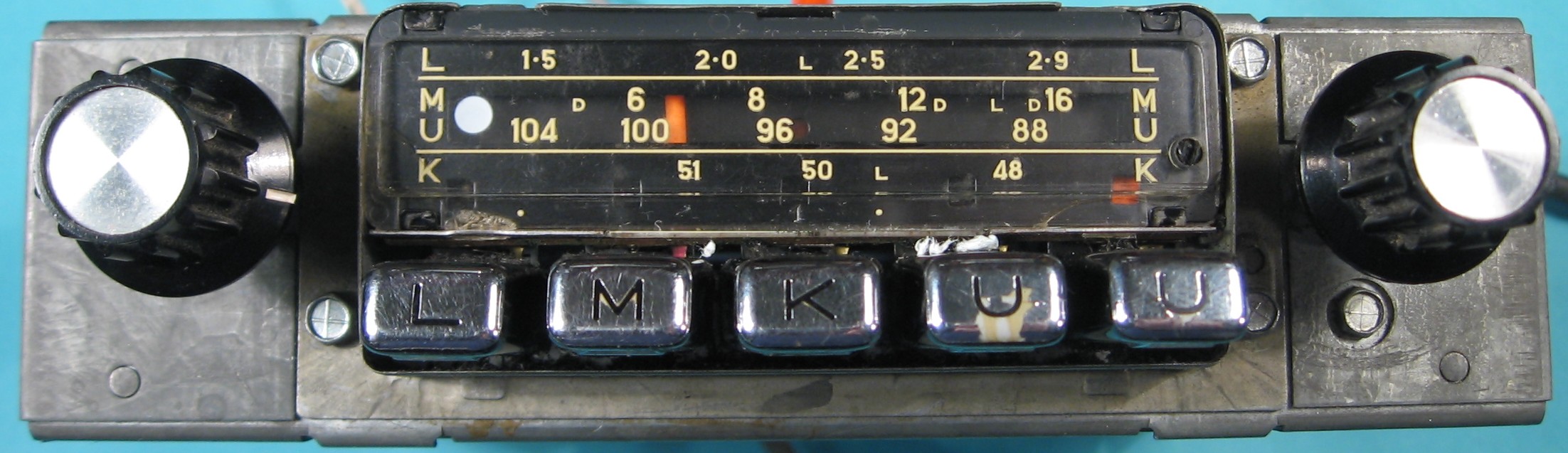 Auch damals war UKW besonders beliebt, wie an den Lackschäden der beiden UKW-Tasten zu sehen ist. Es wurde also meistens zwischen zwei UKW-Stationen hin- und hergeschaltet. Der Hersteller hat die Beliebtheit von UKW erkannt. und deshalb zwei UKW-Tasten eingebaut. Heute ist es schwierig ein Autoradio zu finden, dass alle drei AM-Wellenbereiche besitzt. Abgesehen davon sind die Autoradios seit Jahren schon in der Konsole fest integriert, so dass einem keine große Wahl bleibt. Dann kommt noch hinzu, dass die die moderne Autoelektronik einen erheblichen Störpegel auf den AM-Bereichen erzeugt. Die Zeit haben sich geändert.