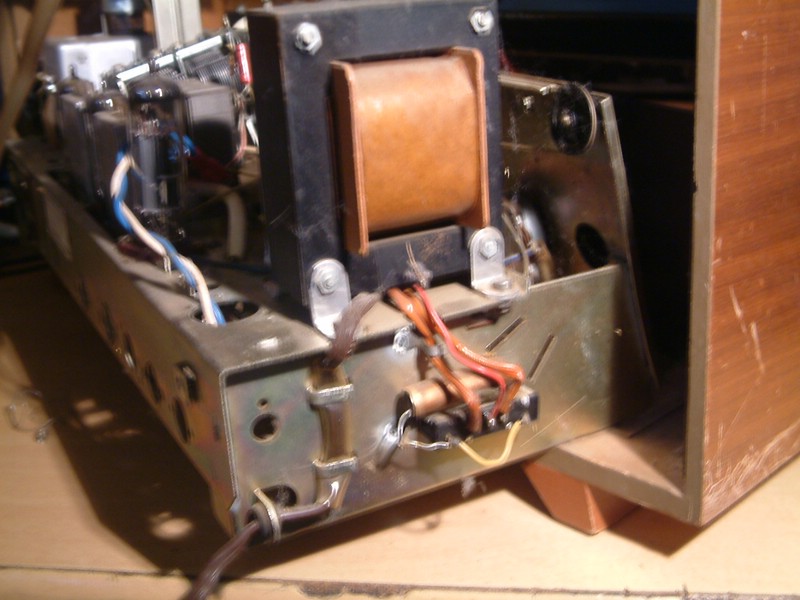 Eingeschaltet: Netztrafo brummt laut, sofort wieder aus. Gerät ausgebaut, auf dem Brückengleichrichter sitzt ein Doppelkondenstor, der hatte eine marode Anschlußdrahtisolierung und Kontakt zum Chassis gefunden. Behoben, Test: Trafo nun zufrieden, 286V an der Endstufe (warm), um 6V an der Kathode EL84 = prima,