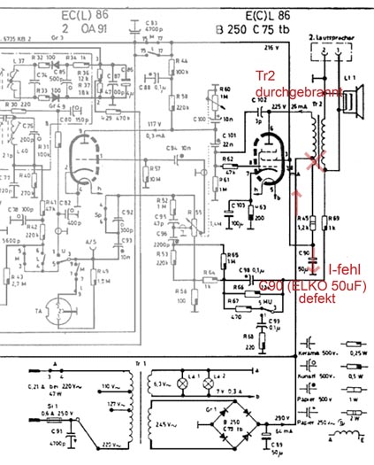 Endstufenröhre eingesetzt und wieder eingeschaltet. Aber, kein Brummen zu hören? In so einem Fall stimmt bei den ollen Geräten mit einer gerade mal 50uF-Siebung was nicht, da hier immer ein wenig zu hören sein sollte. Das bestätigte sich beim Ausmessen der Schirmgitterspannung (im folgenden Ausschnitt rot gekennzeichnet). Nichts von den hier über 200V war messbar.