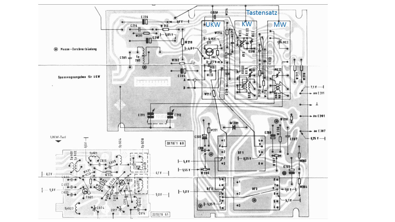 Das Durchmessen der Spannungen lt. Schaltplan ergab, daß an einem Meßpunkt keine Spannung anlag; also mal geguckt, wo die eigentlich herkommen sollte; festgestellt, daß sie am anderen Ende der Leiterbahn anlag; Brücke aus isoliertem Draht eingelötet und es kommt auf UKW Musi aus dem Lautsprecher - recht leise und verzerrt. MW und KW sind absolut tot. Aber um ehrlich zu sein, ohne die könnte ich bei dem Gerät auch leben.