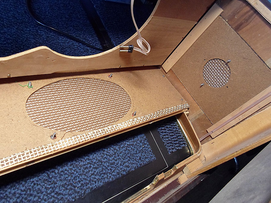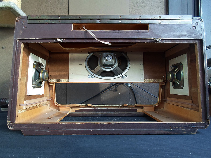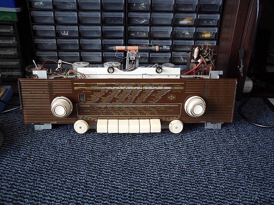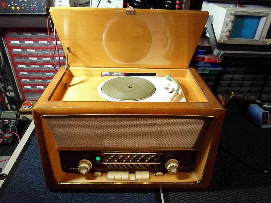 die "Magische Auge" ist sehr schwach und muss erneut werden; der Lautsprecher in die Mitte passt überhaupt nicht; fehlen die Fassungen für die Skala Lämpchen; UKW läuft nur 5 - 7 Minuten, und dann ist der Ton weg; Plattenspieler braucht grundsätzliche Reparatur; Ton Regler (Höhe) funktioniert nicht.