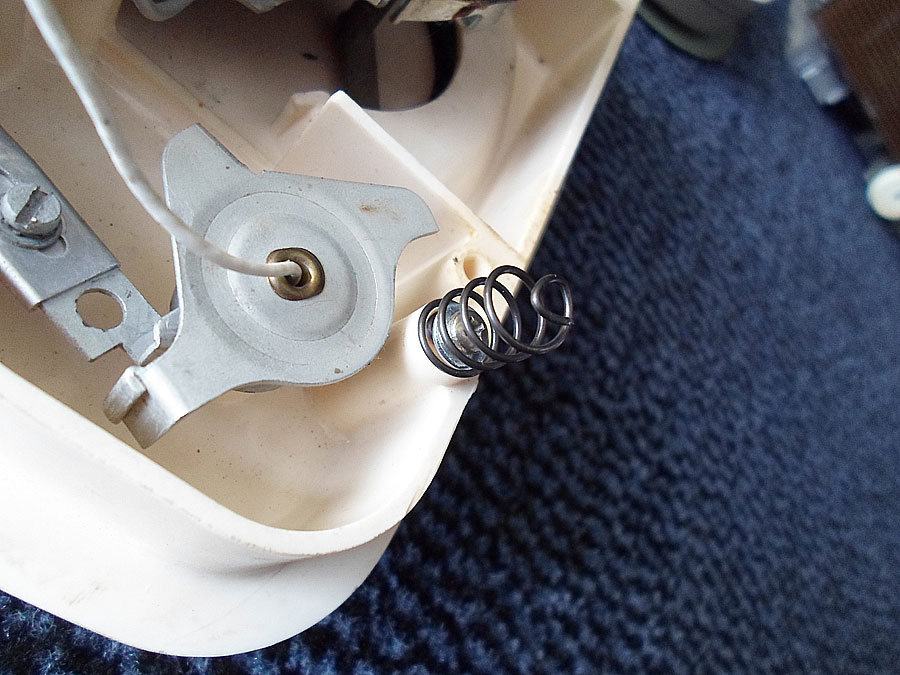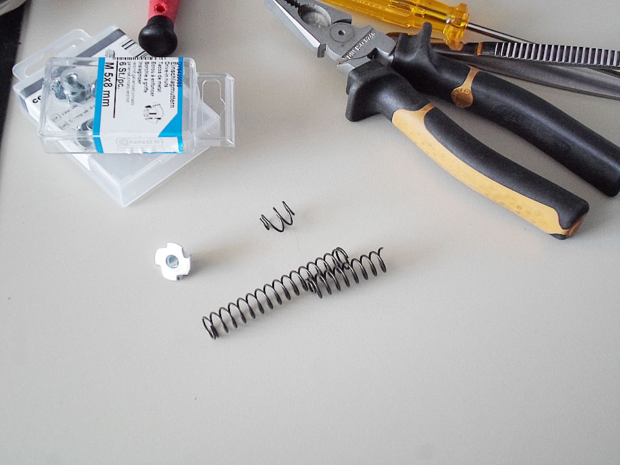 jetzt kann ich anfangen mit dem Plattenspieler. Da ist schon bisschen was. Erst mal fehlen alle vier Druckfedern mit die ist der Plattenspieler auf dem Gehäuse befestigt. Ich muß die ganze Konstruktion selbst entwickeln und basteln. In Internet habe ich leider keine Bilder von diese Teil des Radios gefunden. Dazu habe in Bauhaus die nach meine Meinung, passende Druckfedern gekauft mit Schlagscheiben. Als Probe habe ich erste Feder fertig. Da wird noch ein Bügel fehlen; aber das später.