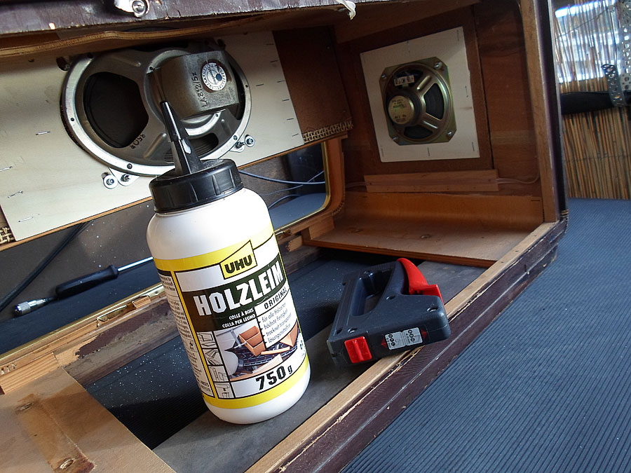 Die Platten für die Lautsprechern habe ich auch fertig. Alles mit Kleber Srauben und Klamern fectgemacht.