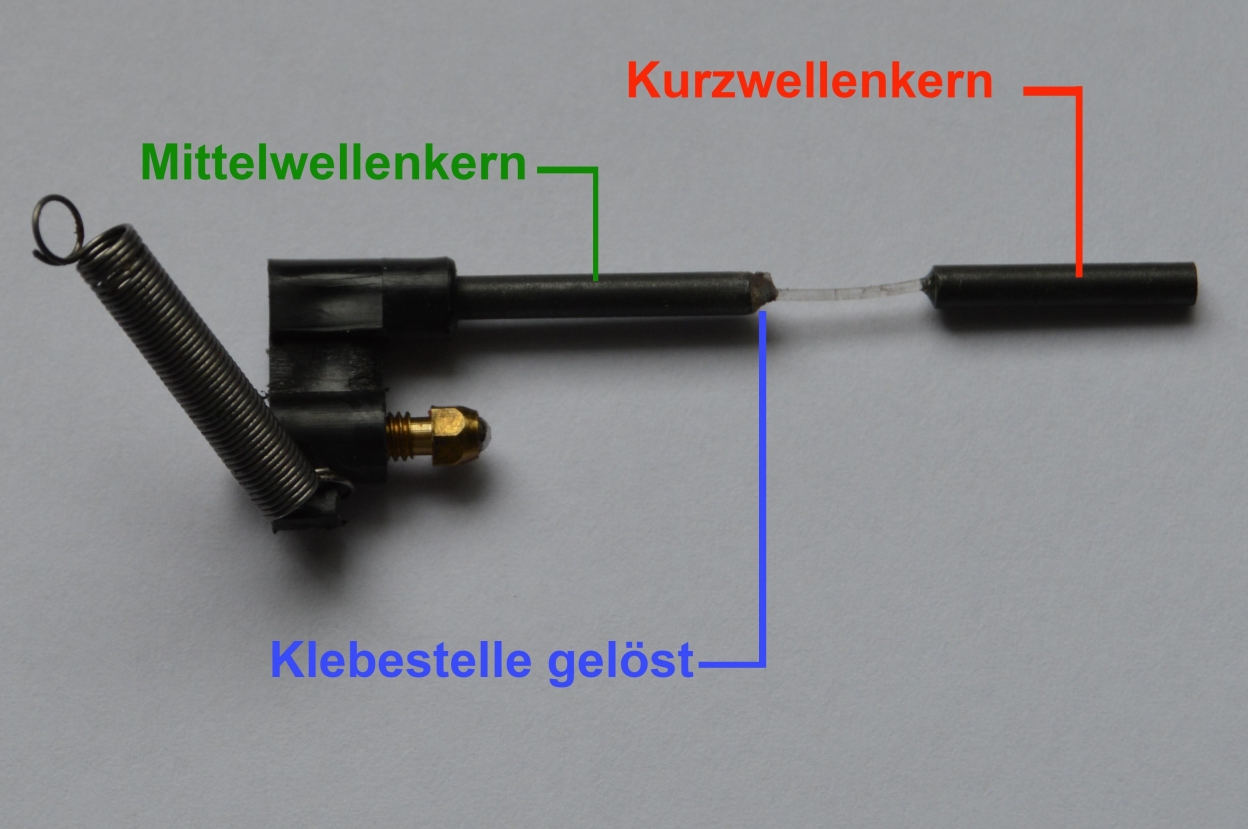 Zuerst folgte ich der Empfehlung von wumpus und drehte das Gerät voll laut nachdem ich den Lautsprecher wie empfohlen ca. 2 Meter vom Gerät aufgestellt hatte. Der Fehler trat nicht auf. Danach klopfte ich mit dem Schraubendrehergriff die Bauteile vom Gerät ab. Dabei stellte ich fest, dass die Mikrofonie am stärksten an einem auf der Rückseite des Drehkondensators angebrachten Variometer auftrat. Das Variometer besteht aus 2 Spulen, wobei eine Spule den HF Zwischenkreis für Mittelwelle und die andere Spule den HF Zwischenkreis für Kurzwelle darstellt. Die Abstimmung der Spulen erfolgt durch 2 Ferritkerne, wobei der Kern für Kurzwelle mit einem Kunststoffsteg an den Mittelwellenkern angeklebt ist. Diese Klebestelle hatte sich gelöst, wodurch sich der Kurzwellenkern unkontrolliert bewegen konnte. Je nach Lage des Kernes wurde die HF Vorstufe so verstimmt, dass diese zu schwingen begann und der Mikrofonieeffekt auftrat. Nach kleben der Verbindung funktionierte das Gerät wieder einwandfrei.