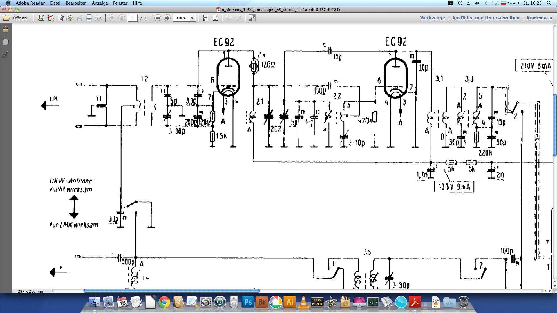 ich bin gerade bei Reparatur von einem Siemens Luxus Super H9 Stereo zu beschäftigt. Allgemein funktioniert alles nicht schlecht bis auf UKW. Und hier ist ein Rätsel aufgetaucht. Wenn ich ziehe erste (auf dem Schaltplan) Roh EC92 raus - funktioniert UKW gut, gutes Empfang, Klang u s.w. Beim Reinstecken die EC92 auf sein Platz, ist wieder UKW tot. Gitterspannung auf erste EC92 liegt bei +8,8V??? Kathodenspannung, bei +9,5V. Anodenspannung setz sich runter auf 98V. Die Röhren habe ich, natürlich, gegen gute ausgetauscht.