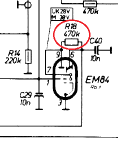 Dann ist Widerstand oder die Zuleitung zu Pin 9 kaputt. Der 470 KOhm Widerstand wird im Chassis sein. Da hilft nur der Ausbau des Chassis um richtig an den Widerstand heranzukommen. Wenn der defekt ist, einen neuen Einlöten. Die Spannung an Pin 1 ist etwas zu klein, aber die EM 84 müsste trotzdem deutlich Anzeigen.