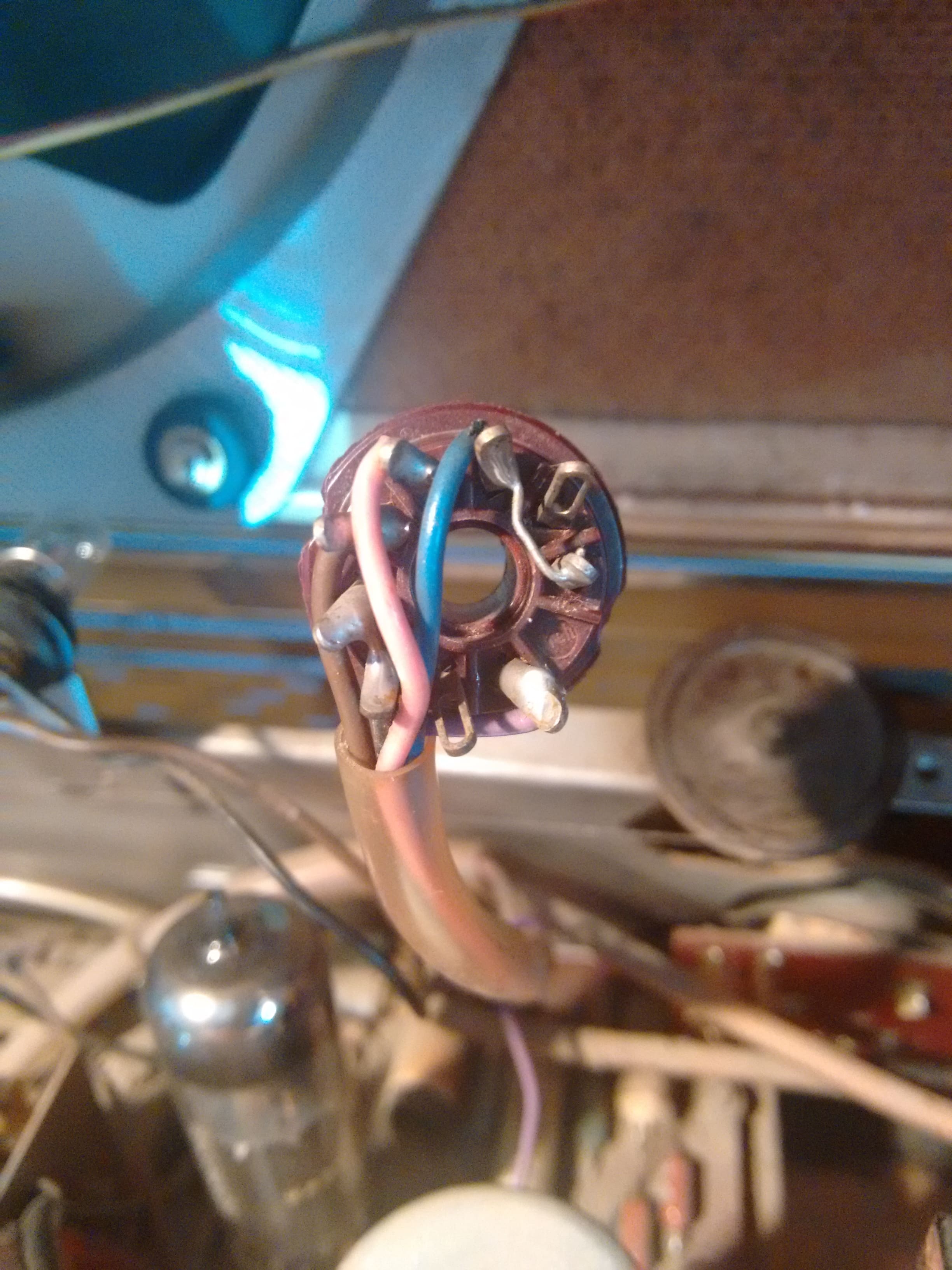 Beim herausnehmen der alten Röhre kam mir ein unbenutzer Sockelkontakt mit entgegen. Diesen hab ich wieder hineingesetzt und leicht umgebogen das er im Röhrensockel hält. Es sind insagesamt zwei Pins komplett unbenutzt bei der EM84 hier. Habe ich vielleicht dadurch etwas verändert?