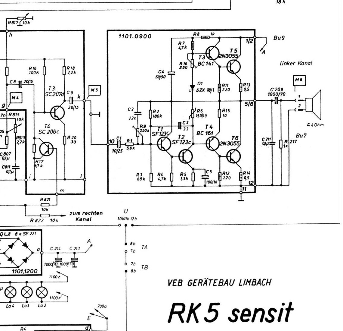 da nur ein Kanal defekt ist, kannst du den Fehler recht einfach durch Vergleich der Messwerte vom defekten (linken) und noch intaktem (rechten) Kanal finden. Als Erstes solltest du prüfen, ob die Endstufe (Modul 1101.0900) defekt ist oder schon das NF-Signal (Messpunkt M5) nicht in Ordnung ist. Das NF-Signal kannst du prüfen, indem du es einem anderen Verstärker am Line-Eingang einspeist. Alternativ kann man ein Sinussignal (Signalgenerator, PC oder Test-CD) am Tonband-Eingang einspeisen, Lautstärke mässig aufdrehen und mit dem Multimeter im Wechselspannungsbereich die Spannung an M5 messen, die sollte beim linken und rechten Kanal ähnlich sein, wenn die Balance in der Mitte steht.